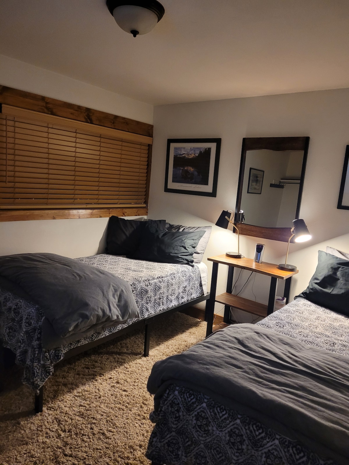 Phumula ku-condo yethu engu-1700 square foot enesikhalazo sendlu eyakhiwe ngamapulangwe yase-Mammoth Mountain. Igumbi lokuphumula line-smart TV enkulu enesistimu yemidlalo yaseshashalazini yasekhaya kanye neqoqo elikhulu lama-DVD. Kunesivinini esikhulu se-inthanethi engenantambo. I-condo inamakamelo angu-3 anamagumbi okugezela angu-3 agcwele, nomshini wayo wokuwasha nowokomisa ngaphandle nje kwekhishi. Ikhishi linezinto eziningi futhi i-condo ine-BBQ yalo yangaphandle. Ukupaka egaraji kumahhala. Itholakala esitezi sokuqala enokufinyelela kwekheshi kusuka egalaji.
