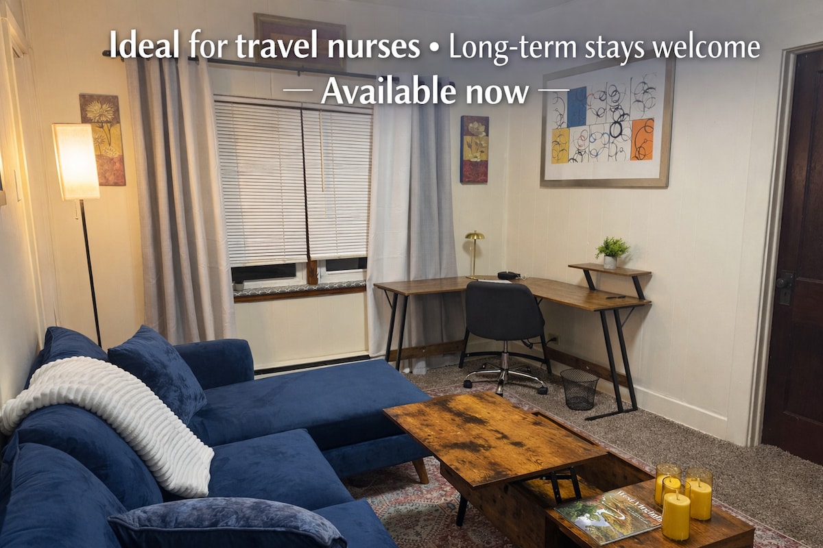 Description: Perfect for traveling professionals, relocations, and extended stays. Cozy, fully furnished 2-bedroom home designed for comfort, remote work, and longer visits. • Fully equipped kitchen and dining area • Fast Wi-Fi with dedicated workspace • Parking included • Convenient location near local shops and attractions. Weekly and monthly discounts are automatically applied for longer stays. Quiet, comfortable space best suited for professionals and extended visits
