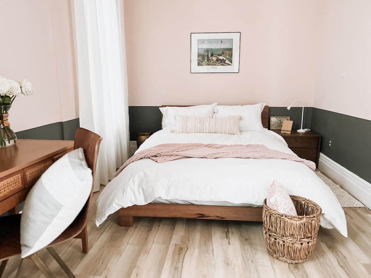 Siyakwamukela ku-casita yethu esesitayeleni nekhangayo, elungele ukuvakasha kwakho okulandelayo! Indawo yethu inombhede omkhulu onethezekile, oqinisekisa ubuthongo obuthokomele nobuphumuzayo ebusuku. Umhlobiso ugqugquzelwa isitayela sesimanje sekhulu leminyaka, esinemigqa ehlanzekile, izinto zemvelo, nobuhle obuhle, obuncane. I-casita itholakala kalula eduze nezitolo zokudlela, izitolo, kanye ne-NJ/NYC Path. Thola uhambo lwesitimela futhi ufike e-NYC kungakapheli imizuzu engu-20! Sithemba ukuthi uzokujabulela ukuhlala kwakho futhi uzizwe usekhaya!