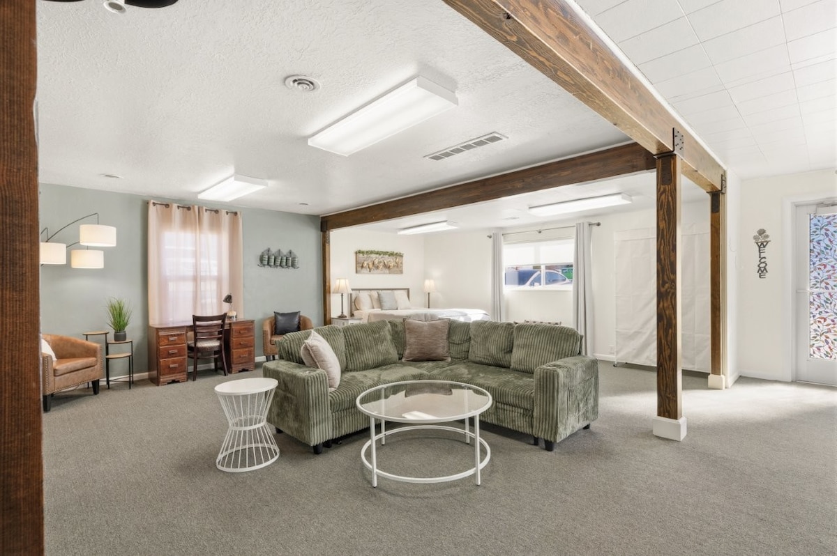 Phumula futhi uphumule kule ndawo ezolile, enesitayela. Maphakathi ne-Ogden, idolobha liqhele ngemizuzu engu-5, futhi izindawo zokungcebeleka zingaphakathi kwemizuzu engu-30-45. Isendaweni ethulile nephephile, le ndawo inakho konke okudingayo ekuhlaleni kwakho kohambo; inekhishi elincane, umshini wokuwasha/umshini wokomisa, igumbi lokugezela, umbhede we-queen murphy, itafula lokudlela, indawo yokuhlala, ideski lomsebenzi, I-WIFI, i-Cable, nendawo yokupaka yamahhala eduze nomnyango wokungena ophrayivethi. Awekho amanani okuhlanza! Futhi, izivakashi ziyakwazi ukungena endaweni engaphandle yezilwane ezifuywayo ezihambayo ezidinga ukunwetshwa.