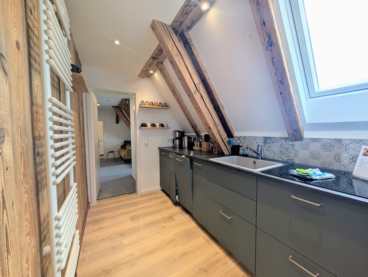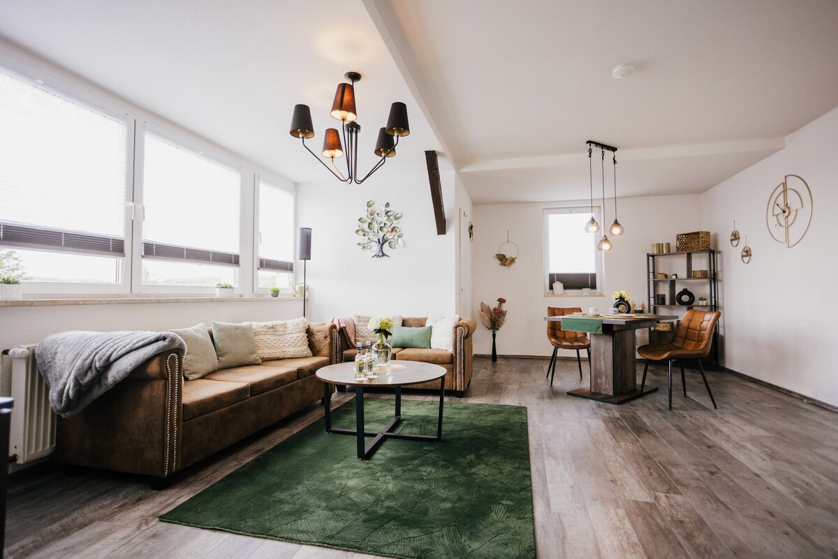 Uyemukelwa efulethini lethu elilungiswe ngothando elinendawo yezimayini. Jabulela iholide lakho lase-Harz ku-65m ², uzungezwe ukuzola kwemvelo - eduze komfudlana nehlathi. Okuvelele kwethu: ikhishi elivulekile, igumbi lokugezela elisanda kulungiswa eline-shower yemvula, ikamelo lokulala elithokomele, kanye novulande onokubukeka okuhle komfudlana nehlathi. Phumula egumbini lokuphumula phambi kwe-smart TV, sebenzisa ideski, noma ufunde incwadi. Umbhede osongwayo, izinja, kanye/noma i-cot yengane iyatholakala ngemali eyengeziwe!