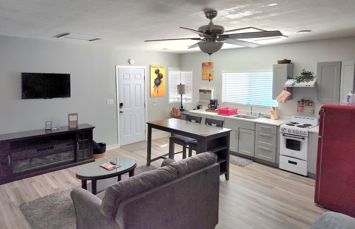Enjoy a quaint, cozy private tiny home near the Las Vegas Strip. This thoughtfully designed space has everything 1–2 guests need for a comfortable stay. Located toward the back of the property with 3 other units, it offers added privacy. Parking included. Inside is a dry kitchenette with a microwave, mini refrigerator, and cooktop for simple meals. The home also features a private patio and ample yard space for relaxing outdoors.
