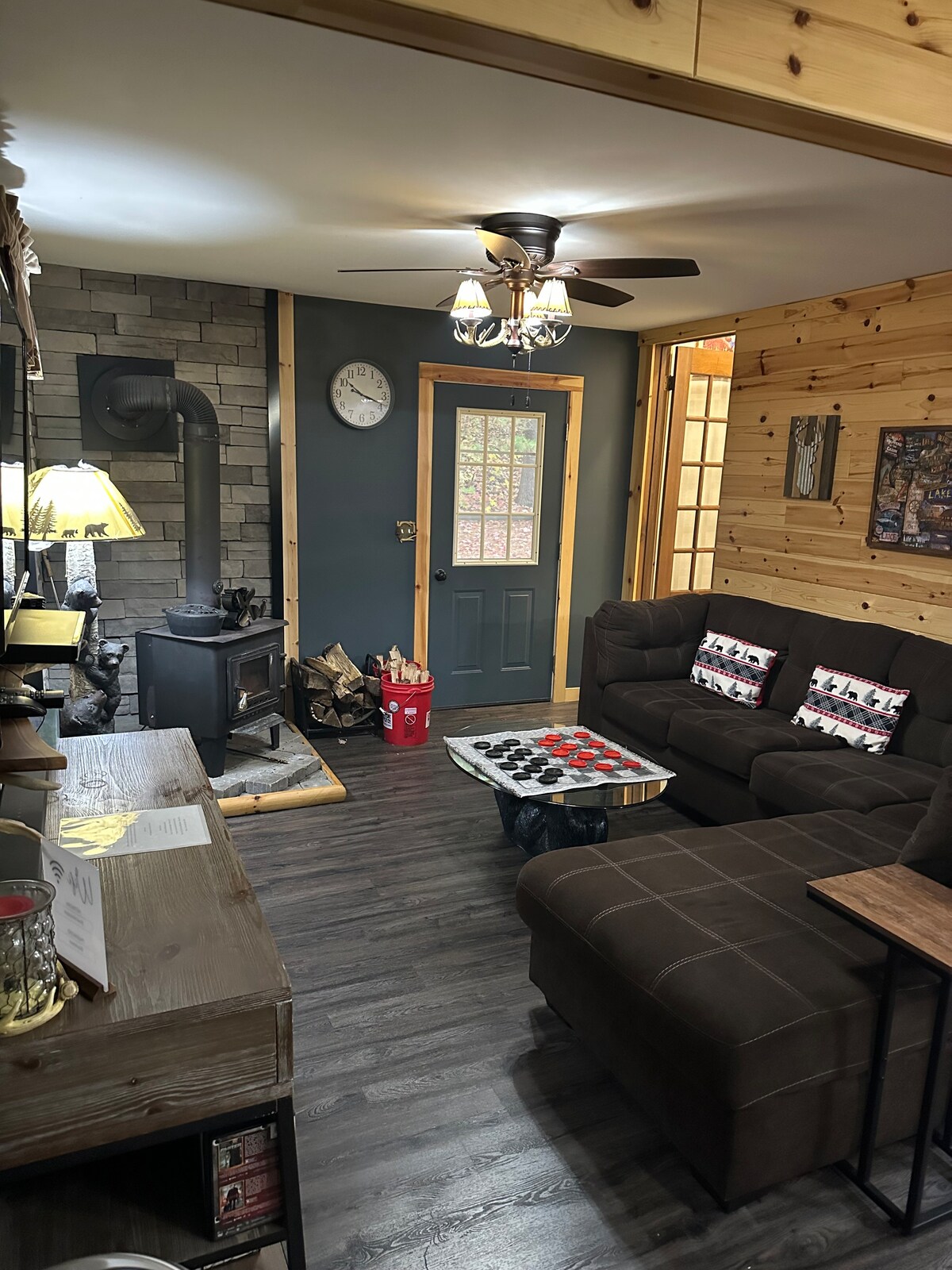 Indlu yethu eyakhiwe ngamapulangwe ehlathini iyisiphephelo esithulile, hhayi indawo yamaphathi. Yakhiwe ngezici eziningi eziyingqayizivele: igumbi lekhabhini lamapulangwe elinesilingi engungxantathu, izindonga zamapulangwe ekhishini elincane/indawo yokuhlala encane ephezulu yokudlela kanye nodonga lwamapulangwe egumbini lokushisa. Iminyango yeBarn yesitayela seCarriage, evela ku-coop yezinkukhu zakudala zabazali bomzali. Ibhande lesitebhisi sensimbi eliklanywe futhi elisikwe nge-laser elinezihlahla zikaphayini. Downstairs walkout basement has ukhonkolo log beams & post, kanye namanye amagatsha esihlahla ukhonkolo. Imizila ngeyokuvakasha okuthulile kuphela, azikho izinjini.