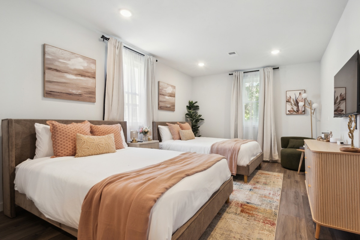 Zizwele ukunethezeka kwesimanje okungamaminithi angu-15 kuphela ukusuka eManhattan NYC kule fulethi elikhulu elinamagumbi angu-4 eWest New York, eNew Jersey. Ilungele imindeni, amaqembu, nabahambi bebhizinisi, le ndawo yokuhlala enhle inezindawo ezinhle, imibhede emibili emikhulu, umbhede owodwa omkhulu, nombhede onemibhede emibili, kanye nama-Smart TV, i-Wi-Fi enejubane elikhulu, ikhishi eliphelele, umshini wokuwasha/ukomisa, kanye nokungena okungenasikhiye. Hamba uye ezitolo zokudlela, ezitolo, nase-Hudson waterfront ukuze ubone izindawo ezinhle zase-NYC — indawo yakho ekahle yasekhaya eduze ne-New York City! 🗽