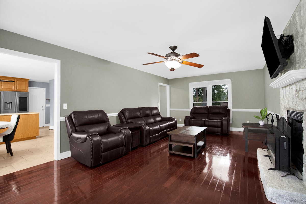 🚗 Kuvaliwe i-I87 nemizuzu eya ku-I95 Uyemukelwa endlini! Leli khaya elinamakamelo angu-3, elinamakamelo angu-2 lihlalisa izivakashi ezingu-6 ngokunethezeka. Jabulela uhlelo lwaphansi oluvulekile negumbi lokuphumula elithokomele eline-smart TV enosofa ongu-55 ". Amakamelo amabili okulala anama-TV! Ikhishi elinezinto eziphelele lilungele izinto zakho zokupheka, elinetafula lokudlela nesiqhingi esivulekile. Phuma ukuze ujabulele ilanga nge-BBQ yethu yegesi-ideal yezindawo zokupheka zomndeni negceke elingemuva elinomgodi womlilo!