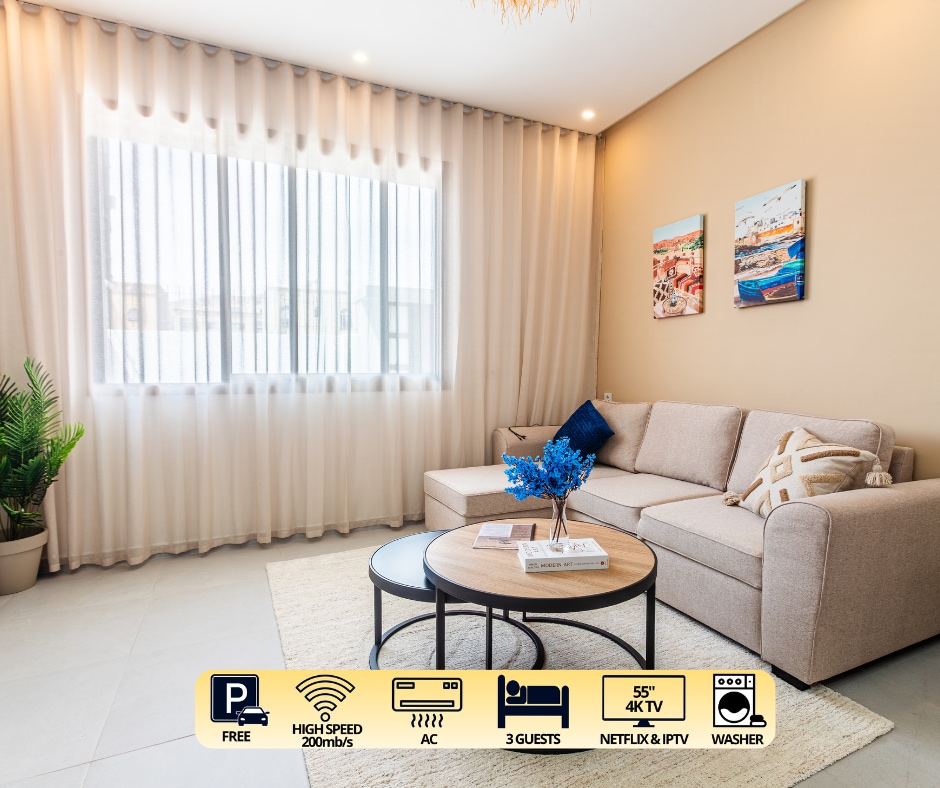 - I-Dar Tilila iyifulethi elihle, elisanda kulungiswa elingasebhishi elihamba ngezinyawo imizuzu engu-5 ukuya ebhishi i-Imi Ouddar elinezindawo ezinhle zolwandle nezintaba - Imenyu yethala eliphrayivethi elinendawo yokuphumula yangaphandle, i-BBQ, i-shower yangaphandle, ama-sun lounger nendawo ye-surfboard yakho. - Uxhumano lwe-inthanethi lwe-fiber optic olusheshayo efulethini kanye nase-Terrace enezindawo zamahhovisi ezingu-2. -Jabulela ukutshuza emagagasini, i-Yoga, i-Jetski, ukugibela amahhashi nokuhamba ngebhayisikili ngemizuzu embalwa nje