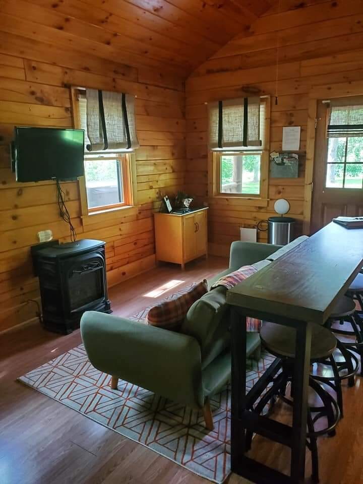 I-Fox Den iyifulethi eliyisitudiyo elinamapulangwe elingamamitha-skwele angu-600 elinakho konke okudingekayo ongakudinga. Yidla ngaphandle noma upheke ekhishini lethu. Ukubuka okuvela kudekhi yakho yesibili kuyamangaza ngezinsuku zokushona kwelanga okwenziwa ngamaphupho. I-loft inophahla oluphakeme, oluvulekile olukunikeza umuzwa wokuba sendlwaneni eyakhiwe ngamapulangwe okukwenza uzizwe ukhululekile ngokushesha. Hamba ngezinyawo emizileni yethu engama-acre angu-10 eseduze nezindawo zethu zokukhempa, okuhlanganisa ichibi lokudoba Indawo yakho eseceleni iphakathi nendawo yezwe lewayini nemizila ye-State Forest