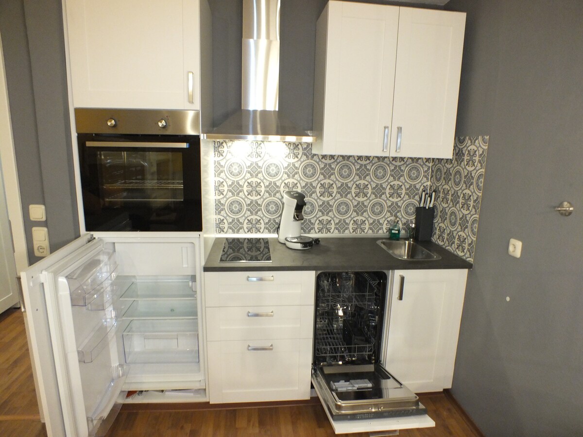 + Vula phansi + Ikhishi elikhulu, elinakho konke + 1 umbhede olala abantu ababili (140 cm) + 1 usofa ogoqwayo ogoqwayo (140cm) + indawo yomlilo + Umshini wekhofi we-Frenshpress + Amathawula nelineni lombhede Izinja ngeshwa azinakwenzeka endlini yehlathi, kodwa njalo zamukelekile,"Igugu elincane elinokubuka" e-Dangast! Ungayithola futhi lapha ku-Airbnb.