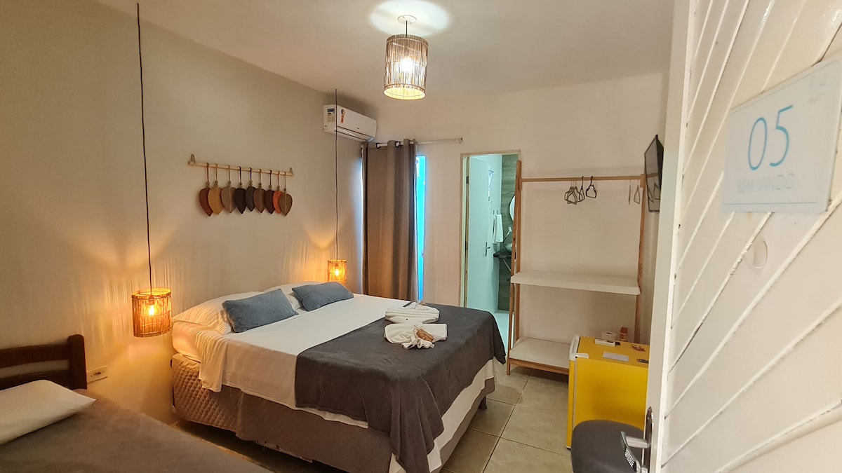 O quarto possui uma cama queen, frigobar, smart TV e ar-condicionado split, oferecendo privacidade e máximo conforto para duas pessoas.