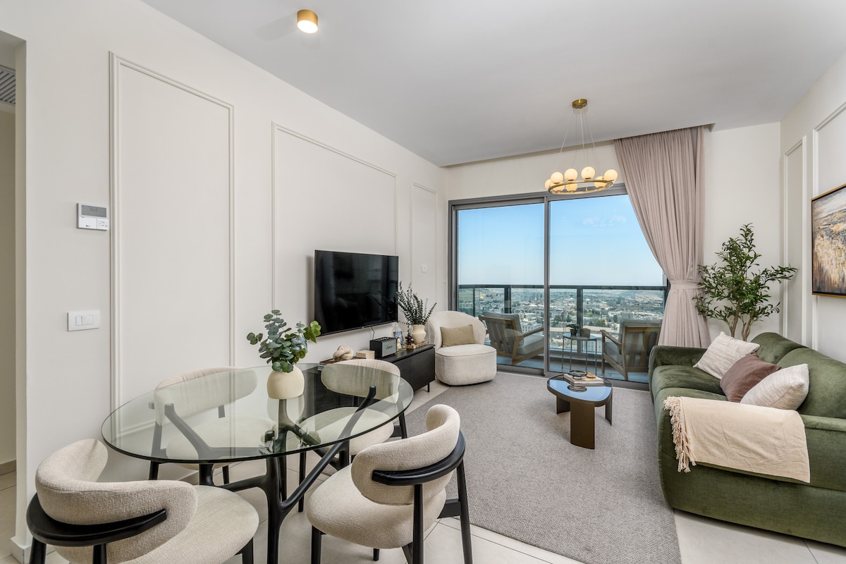 Ngena emhlabeni wobuhle nokunethezeka kuleli fulethi elisezingeni eliphezulu elinekamelo elilodwa, elisesitezi sama-21 se-Savyon Tower edumile – esinye sezakhiwo zokuhlala ezihlonishwa kakhulu e-Jerusalem.<br> <br><br> Idizayinwe ngokucophelela ngokunambitheka okucwengisisiwe nokunaka imininingwane, ifulethi linemibala yemvelo ethambile, ukuqedela kwe-premium, nomoya othokomele kodwa oyinkimbinkimbi. Ingahlalisa izivakashi ezingaba zine, okuyenza ilungele imibhangqwana, imindeni, noma abantu abahamba ngebhizinisi.<br><br>