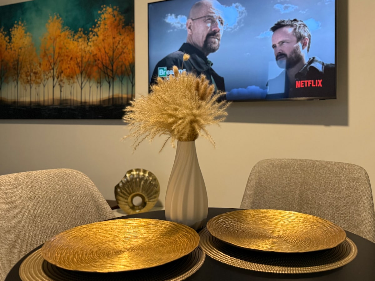 Jabulela okokuzithokozisa okuyisitayela kuleli khaya eliphakathi nendawo. Ukungcebeleka ,ukududuza , ukuceba okusha!!!!! Isitayela sesimanje sasemaphandleni!! Kumnandi kakhulu ukuhlala kuleli fulethi elihle elihlanzeke nge-sanitizer i-Netflix !!!Uzoba nokuhlala okuhle kakhulu i-elgens futhi uzoyihlola finyelela abantu abadala abangu-2 kanye nesithathu embhedeni kasofa (isihlalo SESIVAKASHI SESITHATHU SIZOBA NGAPHAMBI kokuxhumana NABAPHATHI futhi SIBE NENKOKHISO EYENGEZIWE) ukufinyelela okuzimele