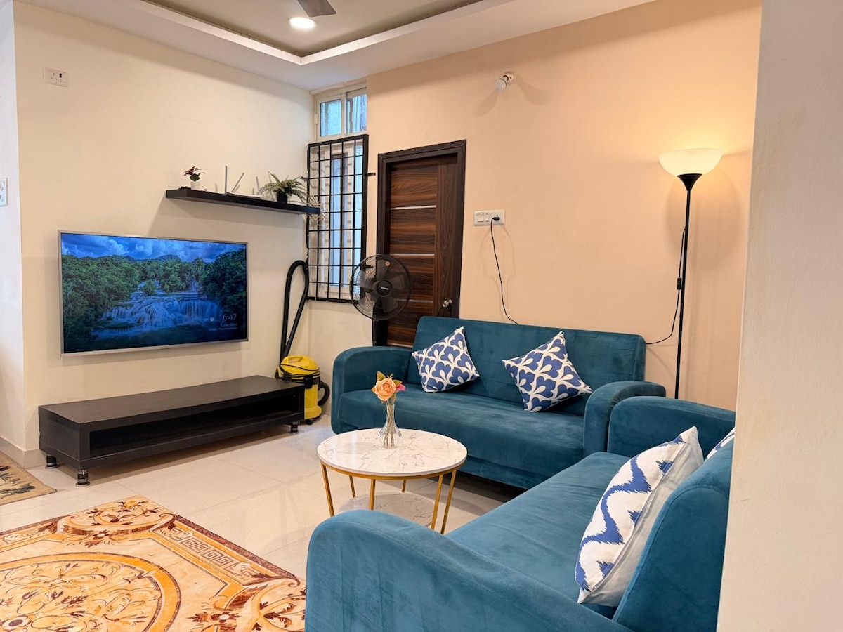 Welcome to your ideal home away from home. Our apartment is on the first floor of the villa without a lift, exclusively for the families only. Unmarried couples and Bachelors are restricted. Our apartment is spacious. A/C in both the bedrooms, with attached bathrooms. Featuring two spacious bedrooms, our retreat ensures a peaceful night's sleep . The master bedroom is with a king-size bed, while the second bedroom is with 2 Single beds, and two additional floor mattresses.