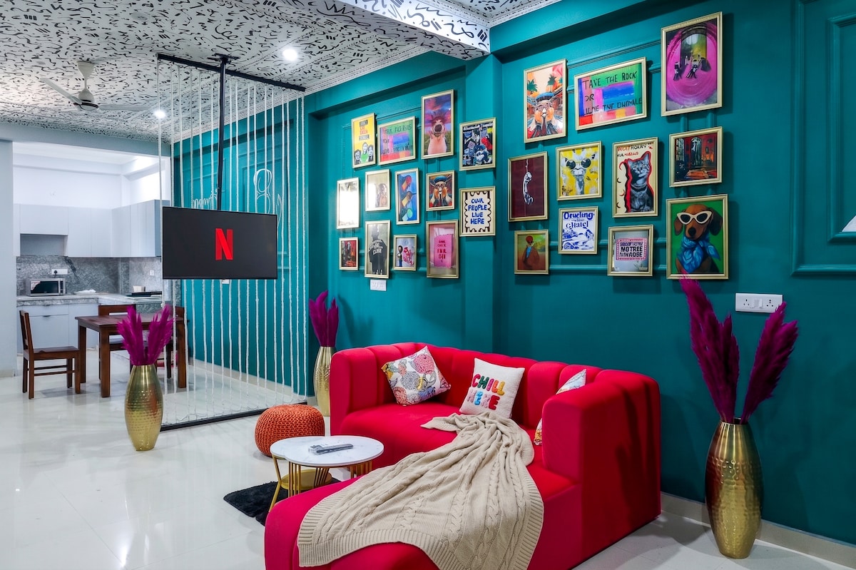 Istudiyo sesimanje nesithokomele e-Greater Noida, esinokuxhumana okuqondile kwe-Metro kanye nemoto emfushane eya e-India Expo Mart. Ukuhlala kwakho kuhlanganisa izinto ezicatshangelwe kahle njengobhasikidi wokwamukela izivakashi, izincwadi ezihleliwe, nezinto ezisemqoka zokugeza. 🛏️ Jabulela umbhede omkhulu, umbhede kasofa, i-WiFi esheshayo, i-Smart TV, ideski lomsebenzi, nekhishi eligcwele. 📍 Isezakhiweni ezifanayo neBurger King, iDomino's, iCalifornia Burrito, namathilomu. Izinyathelo ezimbalwa 🚆 nje ukusuka e-Delta 1 Metro Station. Fourwalls - Ukuhlala okuncane okwenziwe ngothando 💙