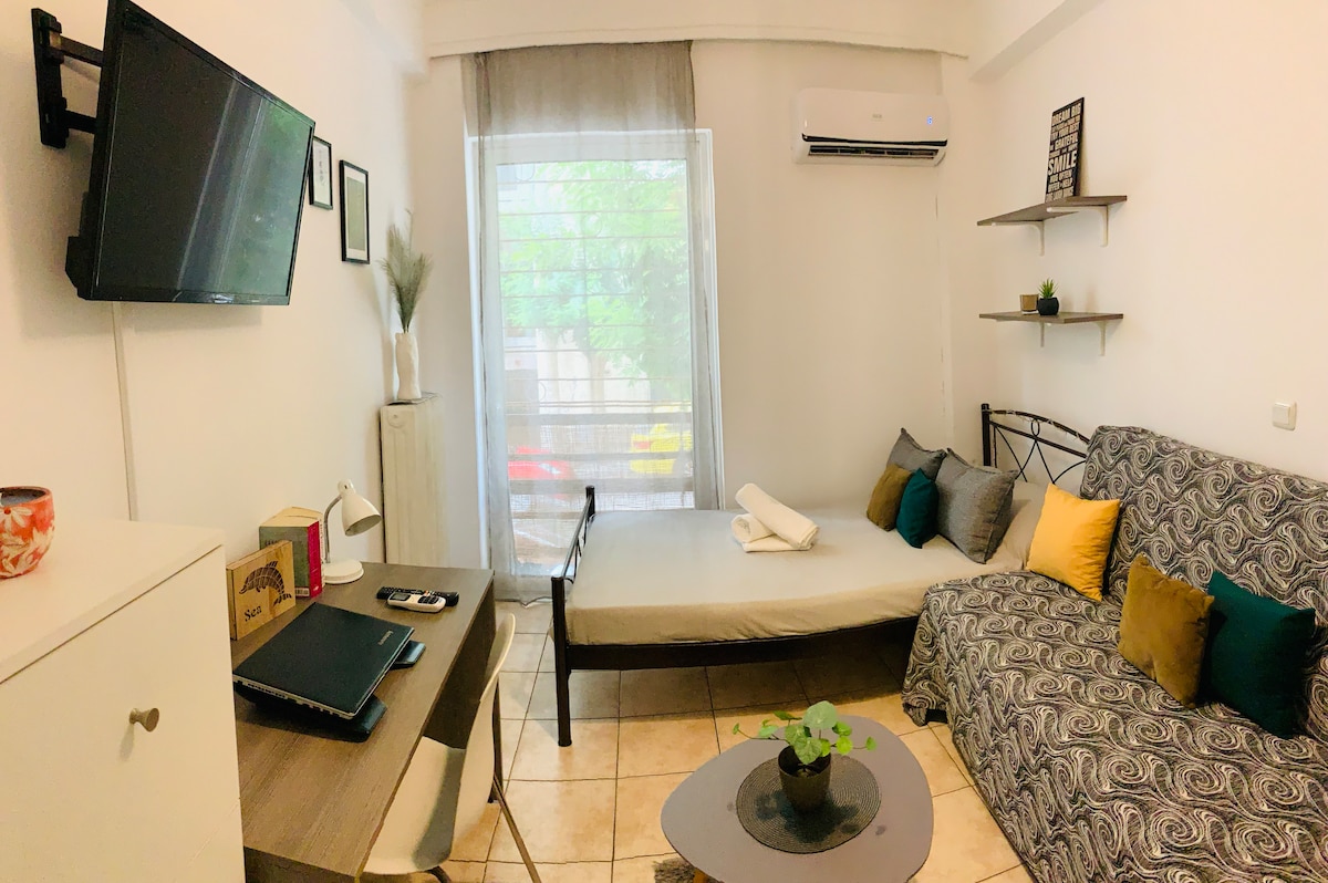 Hello! My place is a small, renovated studio with air-conditioning and a splendid view in a very quiet street with beautiful trees in the center of Athens. It’s close to every public transport (buses, metro, train), easy access to the city’s main attractions. Next to local bars, restaurants, grill-houses and traditional taverns and an open-air market every Saturday. You can find a supermarket in 100m walk and a bakery with the most delicious bread of the area under our building.