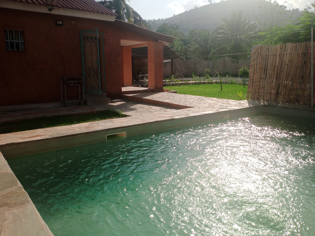Indlu ekahle yokuhlala nomndeni noma abangane ngaphansi kwentaba yase-Kloto, enganakwa. Imizuzu engu-10 ukuya e-Kamalo Waterfall ngezinyawo. Ukuhamba ngezinyawo ihora elilodwa ukuya e-Viale Castle nasemzaneni wase-Kouma. Kungenzeka kube nokuqwala izintaba eziningi ukusuka endlini no-Malick, umnakekeli ovela edolobhaneni lase-Agomé Yoh. Iholide elithulile, endlini enakho konke, indawo yangaphandle evulekile futhi evaliwe eklanyelwe ukuphumula nokuphepha kwawo wonke umndeni.
