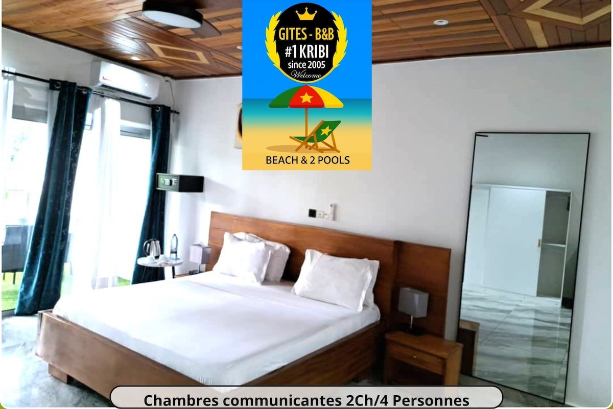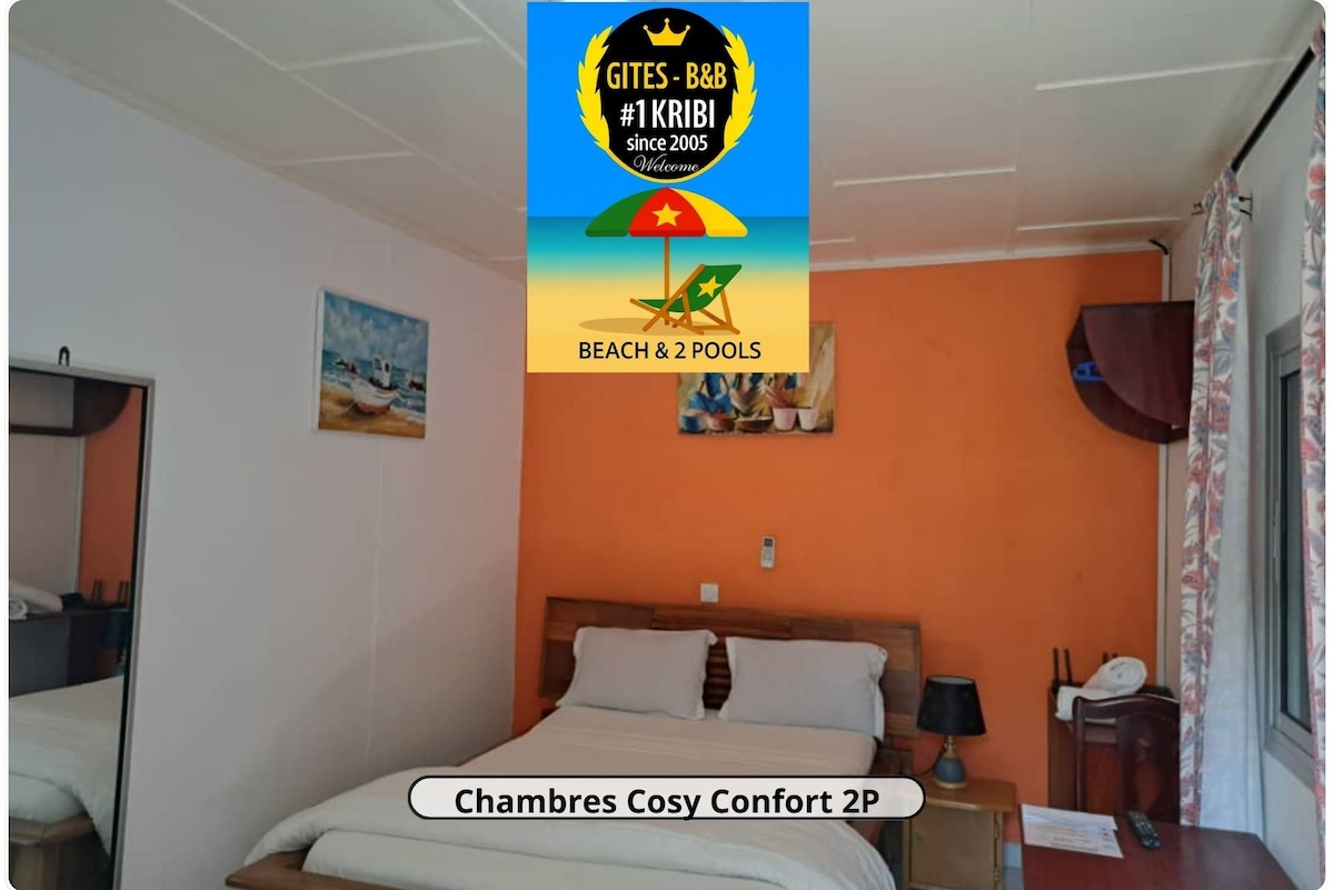 All-you-can-eat breakfast included - Cozy and comfortable room at Gîtes de Kribi, ideal for a budget-friendly stay while enjoying the services of a real hotel: 2 swimming pools, beach just steps away, Wi-Fi, parking, 24-hour security, and a jacuzzi. You also receive a 10% discount on all your meals at the Au Plaisir du Goût restaurant. Just minutes from the Lobé Falls and downtown Kribi. Tropical atmosphere and friendly staff.