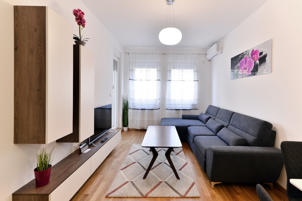 Uyemukelwa efulethini lethu lesimanje nelisha! Leli fulethi elinakho konke lingahlalisa abantu abangaba ngu-4. Kuyisinqumo esikahle semindeni, abangane, nemibhangqwana. Ungapaka imoto yakho egalaji elingaphansi komhlaba, elixhunywe phansi efulethini ngekheshi. Uma ukhetha ukuhamba ngezinyawo, inkaba yedolobha iyimizuzu engu-15 kuphela uhamba ngezinyawo. Ifulethi lethu linikeza ithuba elihle lokuhlola izindawo zase-Novi Sad, ezinokufinyelela okulula kwezokuthutha zomphakathi. Ukuthunyelwa kwesikhumulo sezindiza kungahlelwa ukuze kukhokhiswe imali eyengeziwe.