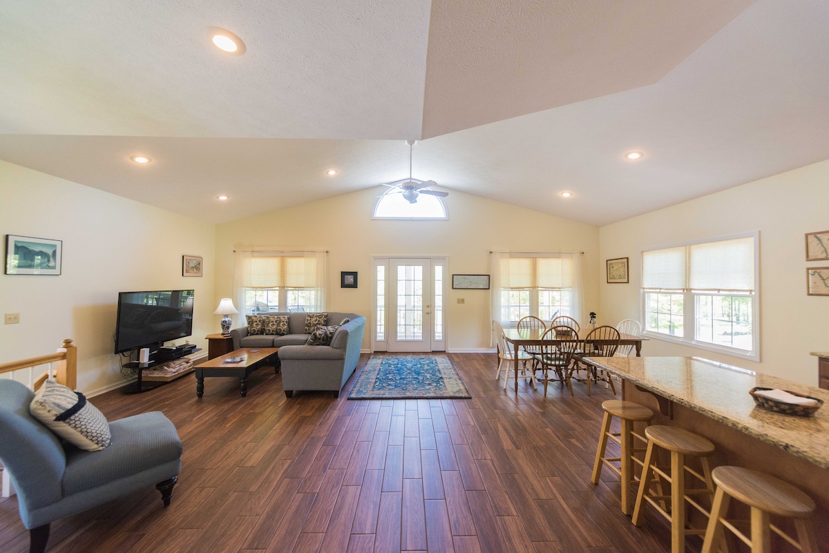 Uzoba NENQOBAKALA YONKE e-walk-out basement apt-(esitezi esiphansi kuphela) sendawo yethu ephezulu ephephile nethulile. QAPHELA KUYABANDA 67-68 uma sisebenzisa i-AC! AKUKHO thermostat efulethini, siyigcina ku-70. Hlola amahektare ethu angu-1.5 anamapulangwe anendawo yokubhukuda (ngenkathi ethile yonyaka) isethi yeswinki nendawo yokubasa. Buka izinyoni ezinama-hummingbird zimunca ama-hawk nezinkozi! Izivakashi ziyayithanda imibhede yethu yenkosi nendlovukazi, amalineni, i-TV engu-50"nekhishi elinesitokwe. Ukunethezeka kwakho kuza kuqala kimi! Kungase kuvunyelwe inja>40lbs, KUFANELE igunyazwe kusengaphambili futhi kukhokhwe imali yesilwane esifuywayo engu-$40.