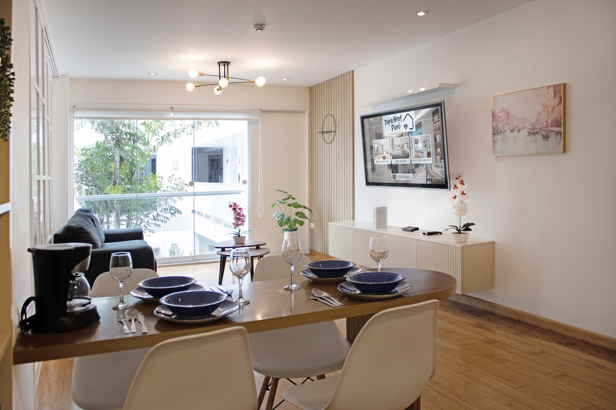 INDAWO ENGCONO KAKHULU, UMHLOBISO OMUHLE Barranco/ Miraflores, izinyathelo ezimbalwa ukusuka e-San Isidro, e-Chorrillos, e-Costa Verde Beaches. Ikamelo elilodwa - Umbhede we-Queen Igumbi lokuphumula eliyi-1 eligcwele - umbhede wosofa ababili Ama-TV ayisicaba angu-2 -Igumbi lokulala negumbi lokuphumula 3 isitofu sikaphalafini -3 ama-burner Ikhishi elivulekile i-Microwave oven Ifriji Umshini wokuwasha wokomisa i-heater yamanzi kagesi I-Air conditioner Balcony Ngaphandle kwendawo yokupaka - Izindawo ezihlanganyelwayo: Indawo yokubhukuda I-Jacuzzi Gym Grill Lounge I-Game Room Bar room, i-giant TV Laundry