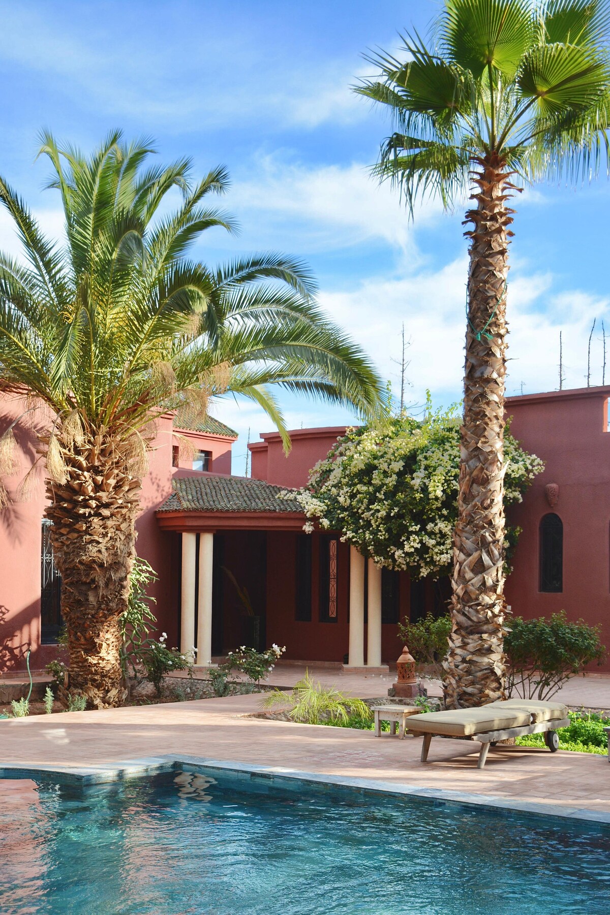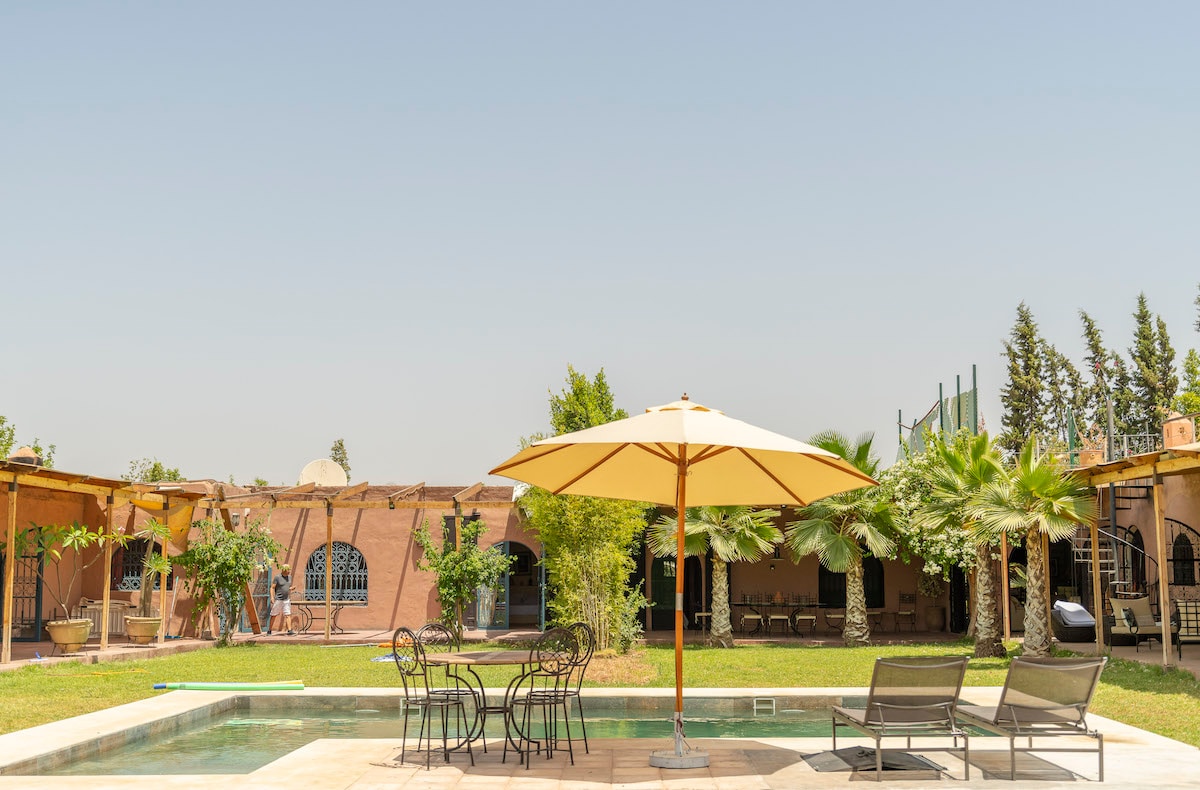 Yivilla yamakamelo angu-5 kanye namagumbi okugezela angu-5, engadini engu-5000 m², engamamitha angu-400 m ². enendawo YOKUBHUKUDA EPHRAYIVETHI engu-15 m x 7 m kanye nengadi ebiyelwe yangasese. Inegumbi lokuphumula, igumbi lokudlela, ikhishi elinakho konke, umshini wokuwasha izandla nethoyilethi, ithala eline-Atlas Mountains. Ishuttle YAMAHHLAKAHLAKA enezihlalo ezingu-14 iyatholakala nsuku zonke ngaphambi kuka-7 p.m. eya enkabeni yedolobha lase-Marrakech. ukulungiselela ukudla, ukuhlanza nokupheka kuyatholakala nsuku zonke uma kuceliwe, kanye nokunakekelwa kwe-Hammam kanye nokubhucungwa.