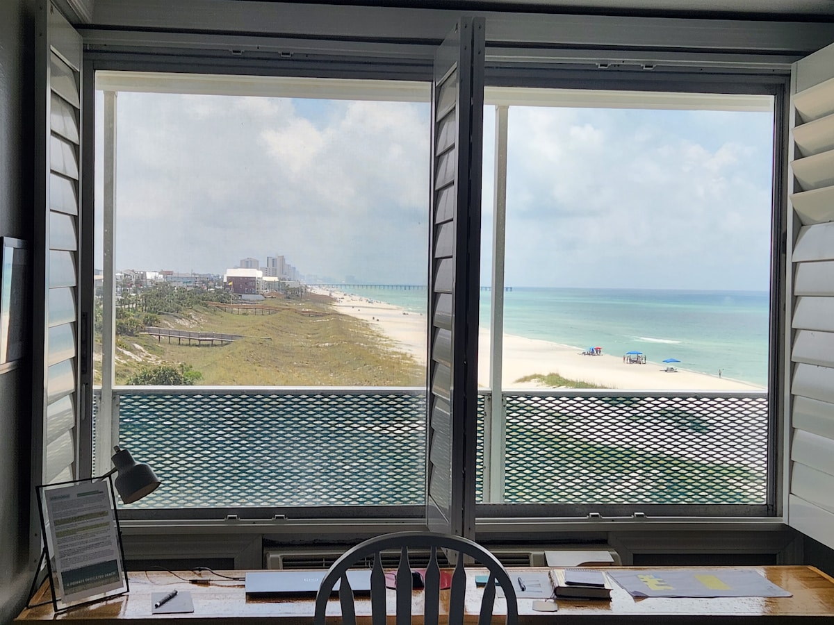 Rare first floor unit with gorgeous views. From your private patio to the water's edge in seconds. Easy breezy- no elevators or stair.. Fresh, modern studio w/ a comfortable king-sized bed and deck chairs to watch the stunning Emerald Coast sunsets. Quick stroll to restaurants, bars, and attractions. Beach chair w/ umbrella provided to guests March 15th - October 31st . Walk to new Top Golf. Construction in parts of the building Fall '25 - Spring '26 . Pool closed this winter for repairs.