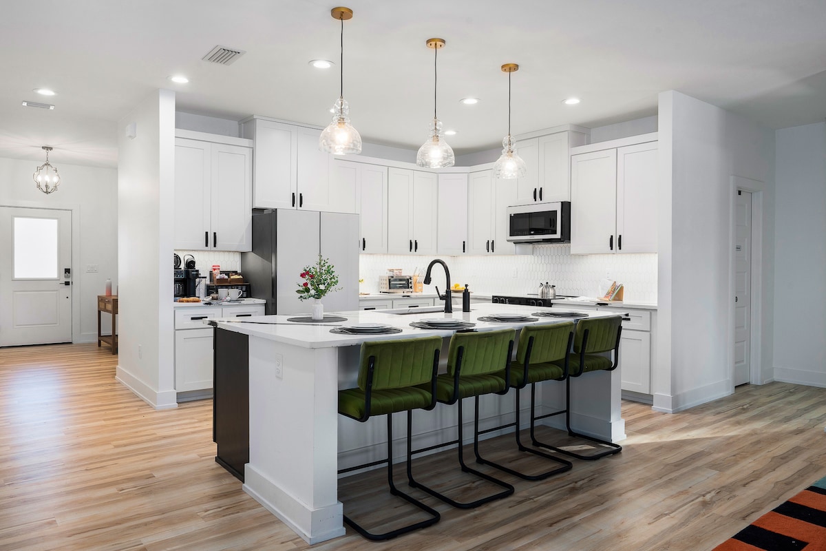 Ukugibela imizuzu engu-2 ukuya ebhishi endaweni yethu yokuhlala engu-4, inqola yegalofu esemthethweni yasemgwaqweni etholakala ngo- $ 50 ngosuku ezivakashini ezineminyaka engu-25+. Hlanza futhi upendwe ngaphakathi nangaphandle kwendawo engamamitha-skwele angu-1,112 ene-hi-speed WIFI, ama-smart TV egumbini ngalinye, ideski/i-vanity, ikhishi elinakho konke okunezinto zikagesi zesimanje, umshini wokuwasha / wokomisa, umshini wokomisa izinwele, ne-ayina /ibhodi loku-ayina, umgodi we-BBQ onendawo yokosa eyisicaba, ishawa yangaphandle, nezindawo zokuhlala ngaphambili nangemuva.
