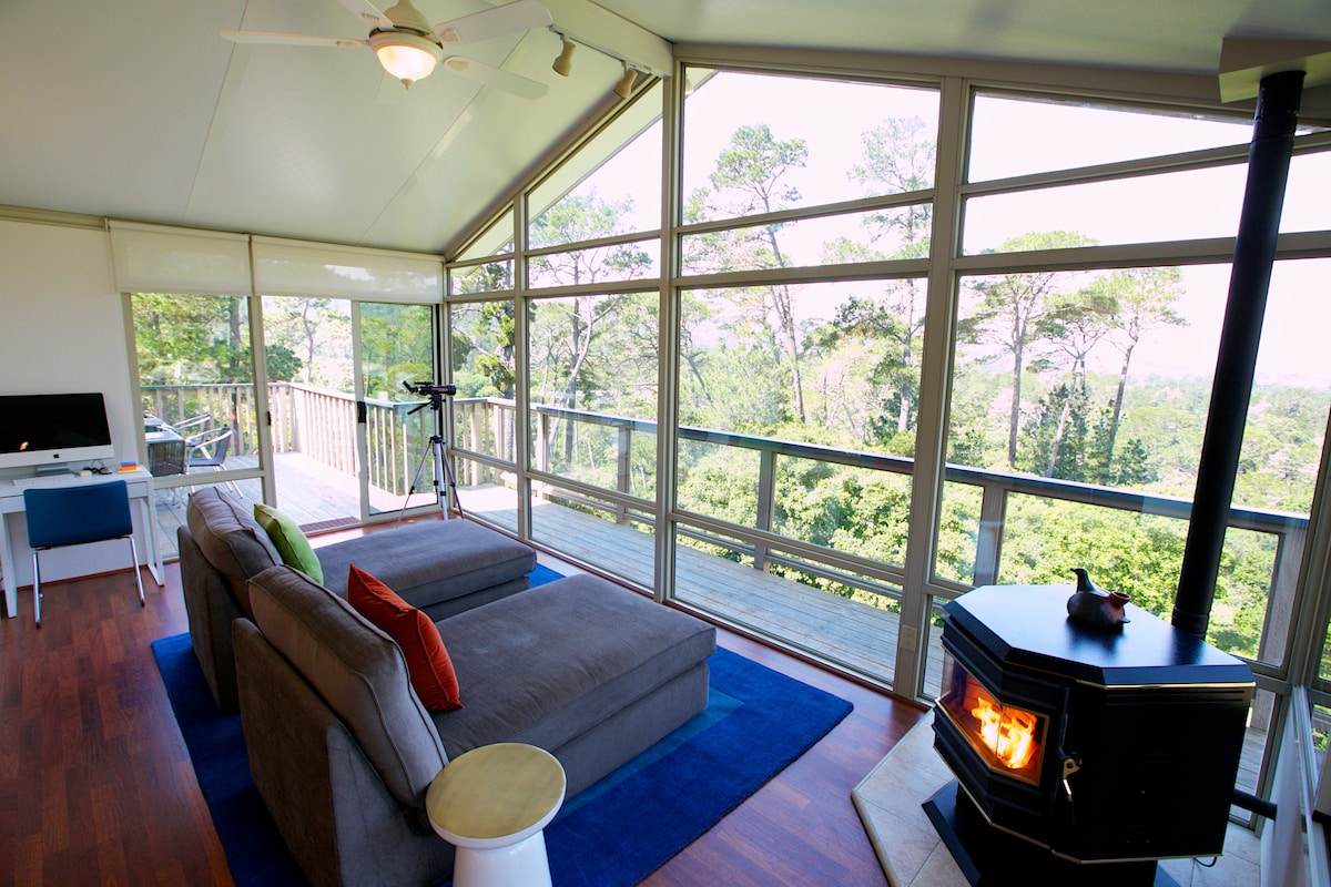 Endlini yethu eyakhiwe ngamapulangwe Yesimanje ephakathi kwama-redwood aneminyaka engu-150 ubudala, sikumema ukuba uqale uhambo oluyingqayizivele lokwamukela izindawo ezingaphandle ngenkathi usuka edolobheni ngemizuzu kuphela. Ukunambitha iwayini enkabeni yedolobha i-Carmel, i-World Class Golf e-Pebble Beach noma imizila ye-Hiking ye-Point Lobos ne-Big Sur. "Magical", "Amazing", "A True Sanctuary" ngamagama ambalwa nje asetshenziswa yisivakashi sethu ukuchaza ukuhlala kwaso nathi. Hamba futhi ukhululeke ngokuthula nangesizungu se-Serene Redwood Retreat yethu. Sicela ubheke incazelo yendlu.