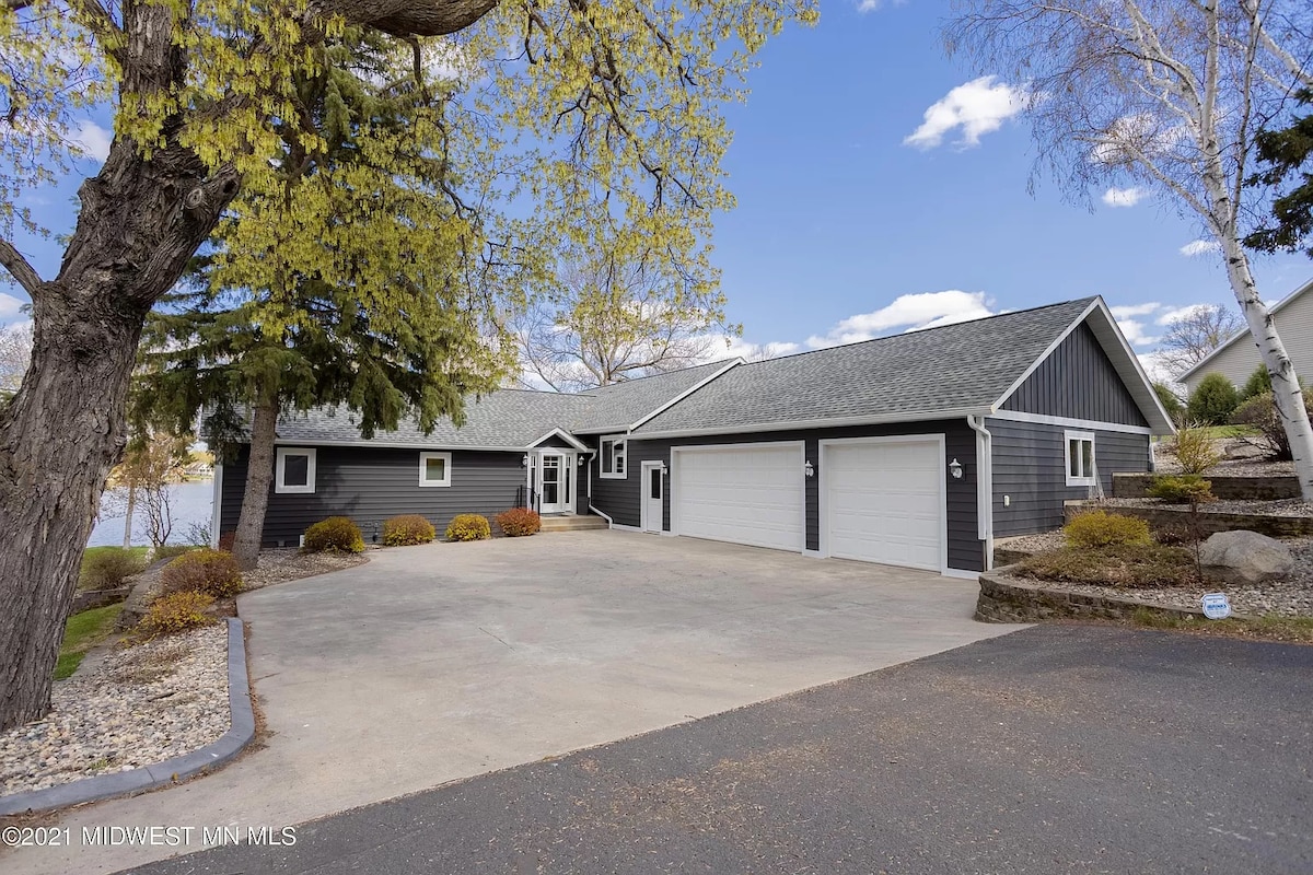 *I-PONTOON (efakwe enanini maphakathi no-May-begin Oct) * UBHAVU WAMANZI ASHISAYO *I-SAUNA* i-wood FIREPLC *UMDLALO we-RM Lake front iholide kuleli khaya elimangalisayo, elinefenisha ephelele, elivulekile elinombhede ongu-3, ubhavu ongu-4, kanye ne-rm yehhovisi/ibhonasi! Jabulela ukudla ngaselwandle ku-2000sqft "Great Patio" enikeza i-pergola, ubhavu wamanzi ashisayo, itafula lomlilo, nendawo yomlilo, isihlabathi sikashukela phansi kwechibi nendawo eyengeziwe yomlilo eseduze nolwandle, i-Lily pad, i-kayak, nedokhi eliphrayivethi. Ngena ku-9+ indawo yokudlela/imigoqo/i-sandbar/ibhishi/ipaki ngesikebhe!