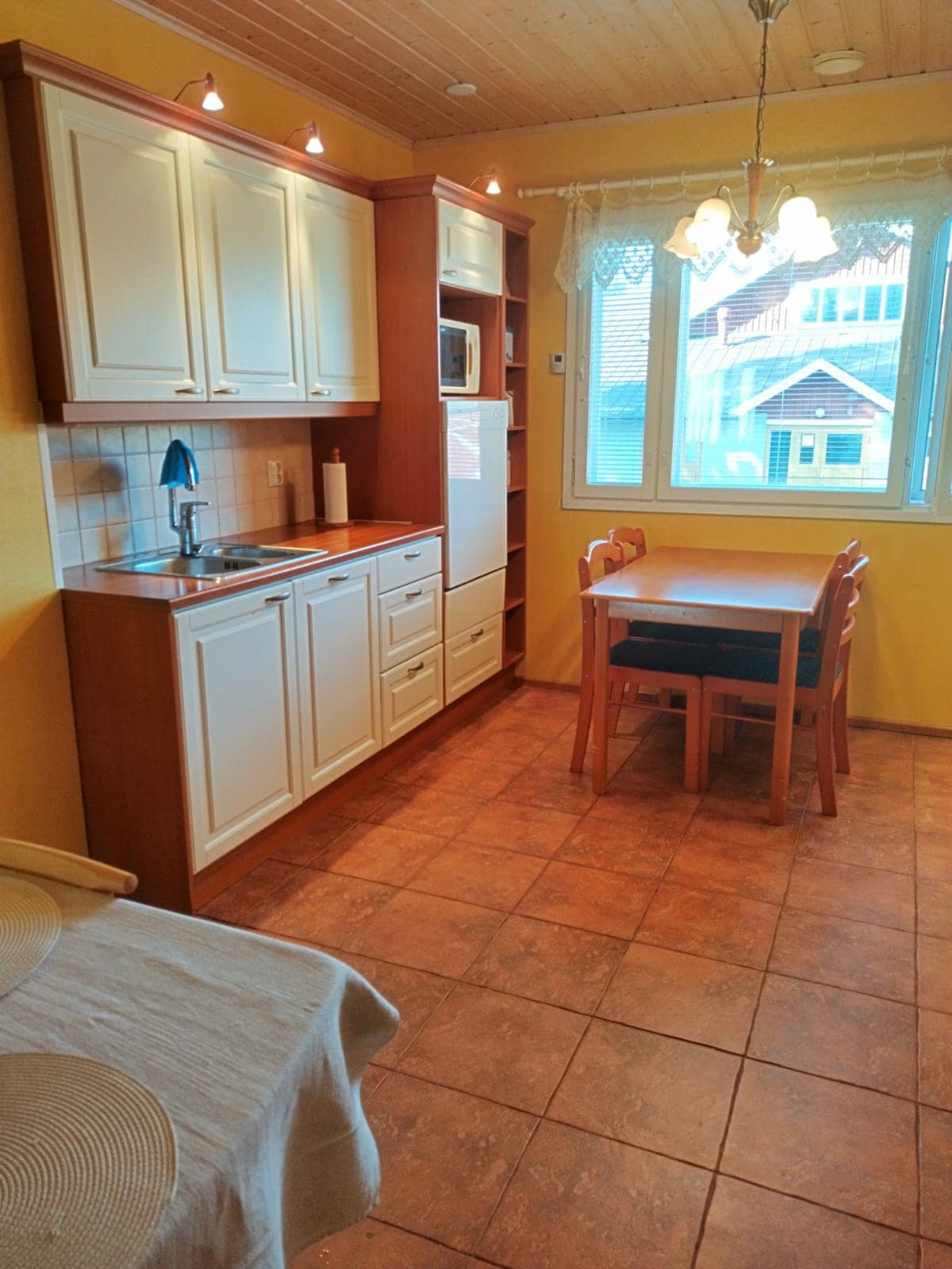 Kukhona ikhishi elincane efulethini, mh, i-toilet-ph-sauna. Indawo yokupheka (izitsha ezisetshenziswayo), umshini wekhofi, i-micro, i-kettle, i-toaster, ifriji ne-freezer. Ikhofi, itiye, ushukela nosawoti kuyatholakala :) Izinto zokulala zifakiwe. Umbhede ongu-160 cm kuphela ububanzi ku-Mh. Usofa ogoqekayo ku-Oh. Umndeni onezingane unesihlalo sokudla, umbhede wokuhamba, isitsha, nobhavu wezingane. Ukushisa / ukupholisa ngepompo lokushisa lomoya. Ithelevishini yobuciko I-Wifi / uxhumano lwe-fiber olungaguquki lufakiwe.