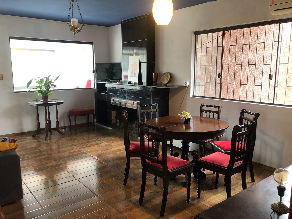 Casa em estilo Jk, quarto/sala amplos, ambiente aconchegante, bem arejado e climatizado. Disponibilidade de uma cama de casal e um sofá-cama. Cozinha completa. Fica à disposição produtos para café da manhã.