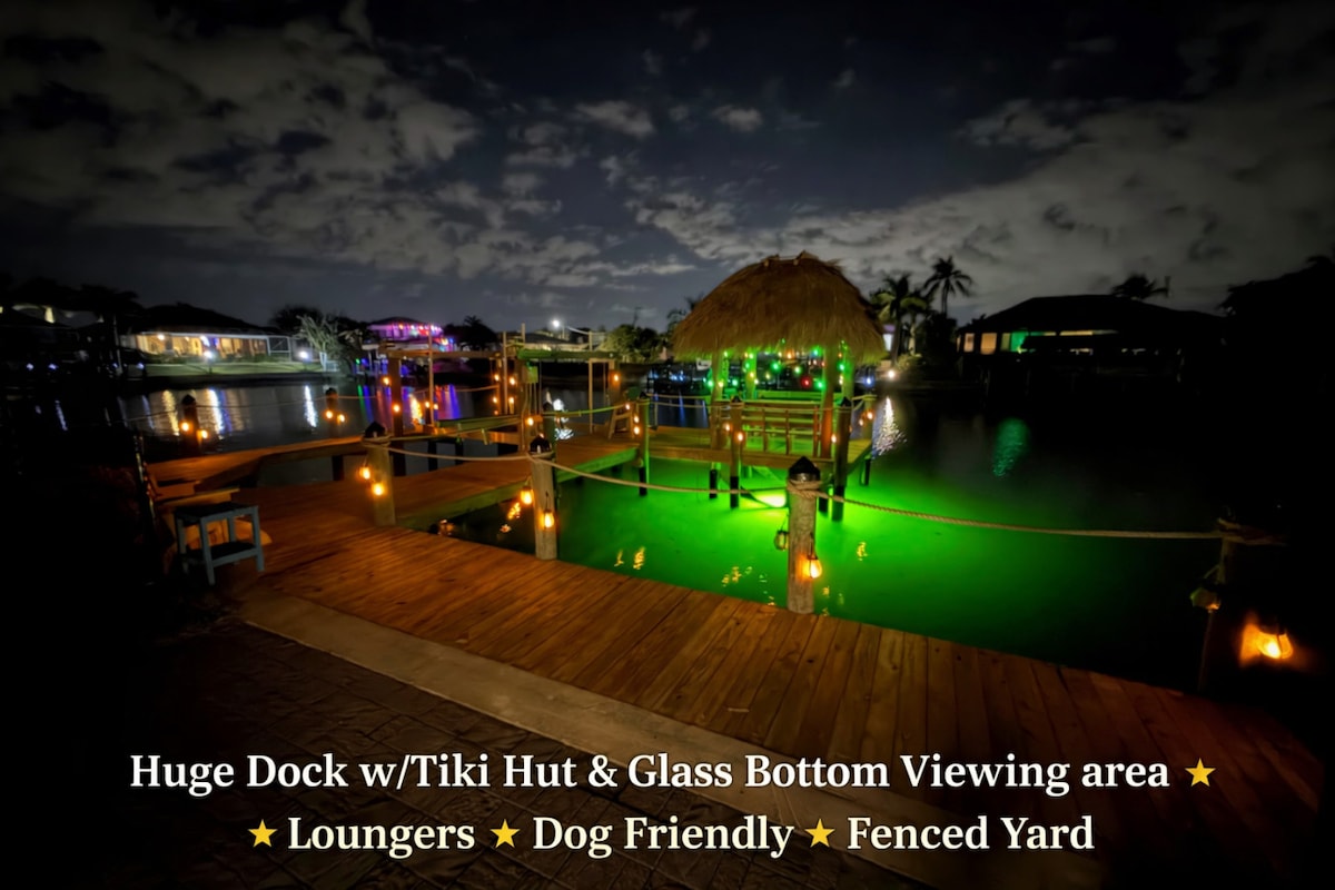 Villa Salt & Sol, an elegant, Coastal retreat in the yachting community of Cape Harbour, Cape Coral. Framed by stately royal palms - just 3 blocks from Camelot Park - Tennis/pickleball courts, playground/picnic areas, VILLA Salt & Sol blends upscale comfort w/coastal tranquility. • Gulf Access • 4 Kayaks • Dock w/13,000lb lift/Tiki Hut + glass bottom viewing area • Smart TVs in bdrms/2 liv rms/pool area • Beach/Fish Gear • Dog OK • Fenced yard • Free HTD Pool • Adults/Kids Bikes • Baby Gear