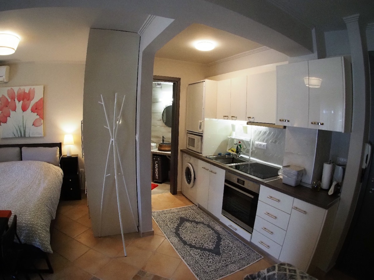 I-brand entsha, kanokusho, ekhanyayo Ground Floor Studio 3 ् ukusuka emgwaqeni wendandatho kanye ne-10 ् ukusuka enkabeni yedolobha. Ngomatilasi wekhwalithi ye-anatomical nemicamelo ukuze ube nokokuzithokozisa okuphumuzayo nokuyingqayizivele. Endaweni ethulile futhi esiteshini sebhasi esingu-40m (32 A). E-400 m yi-Evosmos square enezindawo zokudlela eziningi, njll. kanye ne-Super Market eseduze nendawo yokupaka yamahhala. Inekhishi elinazo zonke izitsha ne-Smart TV HDR 55 "ne-Netflix. I-Wifi imahhala engu-100 mps.