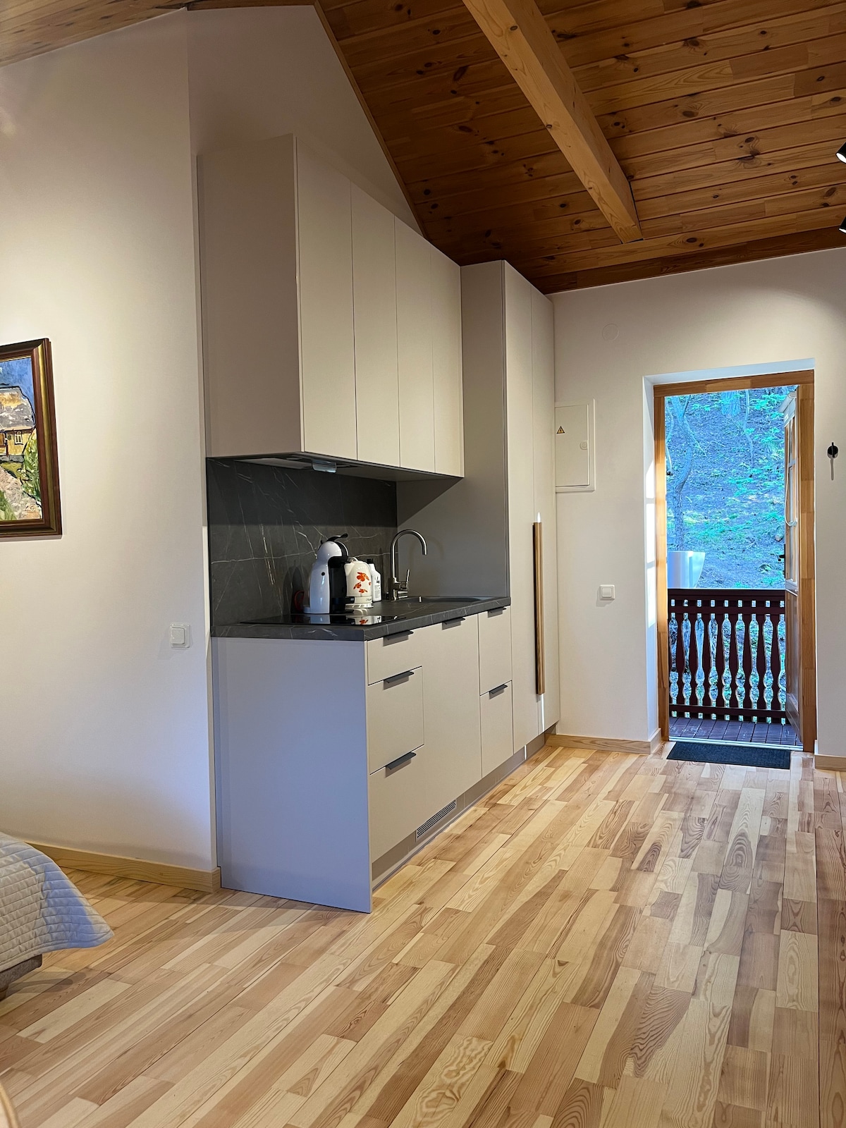 Indlu isendaweni ekahle kakhulu engamakhilomitha angu-4 kuphela ukuya enkabeni yedolobha (imizuzu engu-15 nezithuthi zomphakathi). Indlu ithokomele kakhulu futhi iklanyelwe abantu ababili kodwa inombhede owengeziwe onethuba lokulala kwabanye abantu ababili.