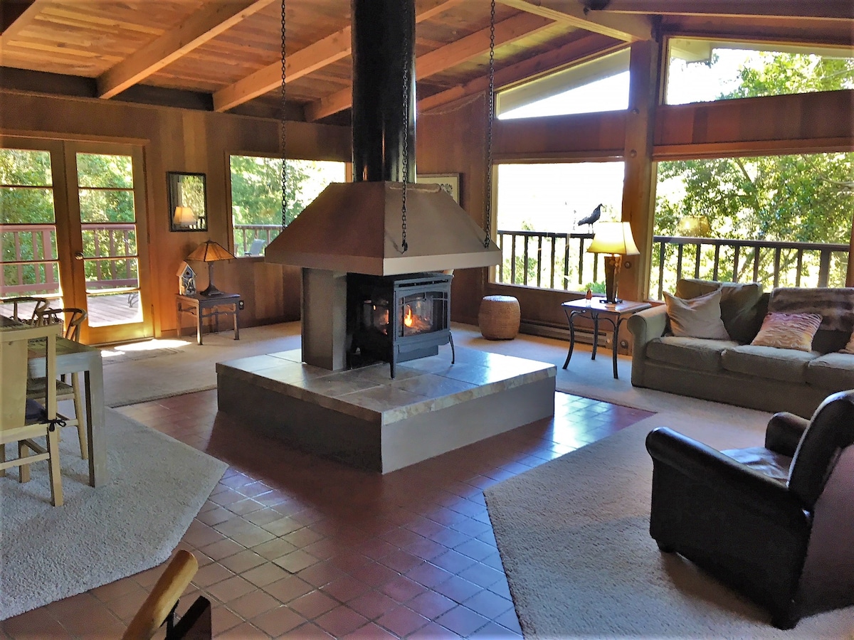 ** Kusandakuvuselelwa/kufakwe ifenisha kabusha!** Le ndlu yaqanjwa ngokuthi 'The Ranch House' ngumklami wayo u-Don Jacobs, le ndlu eyakhiwe ngamapulangwe elungisiwe yama-70 iyindawo yokuvakasha yasehlathini enokuzwela kwesimanje. Indlu izungezwe ama-redwoods & inamadeski amakhulu angu-2, i-firepit engu-1 w/propane w/ukuhlala okwanele, enye i-w/ubhavu wamanzi ashisayo. Igumbi lokuphumula linamafasitela esithombe w/ukubukwa kwehlathi nesitofu esishisa izinkuni sase-Morso. Izivakashi zikhuthazwa ukuba zijabulele imizila yokuqwala izintaba, amachibi, namasevisi angaphandle. Indlu ilala ngokunethezeka u-4, kanye ne-inthanethi ye-fiber-optic
