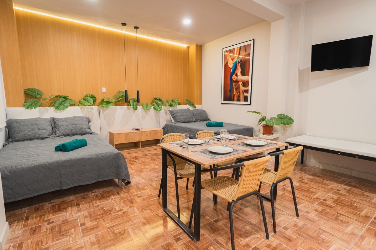 Thola ubuhle be-Amazon kule loft entsha emangalisayo egqugquzelwe ubuhle bemvelo behlathi lase-Peru. Itholakala emizuzwini engu-5 kuphela ukusuka e-Iquitos Center. Zizwe usekhaya ngamasevisi angcono kakhulu futhi uphumule! Ziphe isikhathi sokuvakashela i-Iquitos Cathedral, i-Iron House, i-Old Palace Hotel, i-Cohen House, i-Morey House, nokunye okuningi-zonke ziseduze kakhulu nestudiyo! Hlola idolobha elithakazelisayo lase-Iquitos emigwaqweni yalo egcwele izimfihlakalo zoMfula i-Amazon.