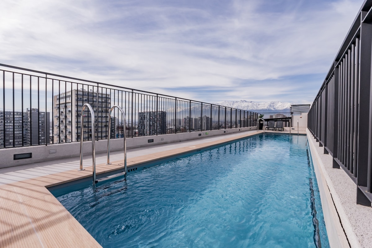 Ikhaya lomndeni wakho e-Santiago elinendawo enhle engeke ilibaleke! Le fulethi elikhulu elinamagumbi okulala angu-2 liyindawo ekahle yokuzipholela phambi kwezintaba. Kuseduze neMetro, ihlanganisa ukuthula kwekhaya elithokomele nokuxhumana okuphelele nedolobha. Kuhlanganisa indawo yokupaka futhi kulala abantu abangu-6 Okuvelele: • Ukungena: Indawo yokungena ezimele enesilokhi esihlakaniphile nomuntu onikeza usizo 24/7. • Amasevisi: I-WiFi esheshayo, i-Smart TV, amashidi namathawula • Okwengeziwe: Ukuwasha, izindawo eziluhlaza, nemidlalo