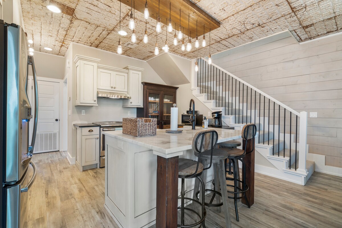 Siyakwamukela ku-The Jewell of Eufaula, indlu eyakhiwe ngamapulangwe enombono ophrayivethi wechibi lase-Eufaula usuka egcekeni elingemuva. Lena yindawo ekahle kakhulu yokungcebeleka nokuphumula nomndeni nabangane. Singamakhilomitha angu-1/2 ukusuka endaweni eseduze yesikebhe. Sine-grill ye-pellet, imidlalo yotshani, umgodi womlilo, itafula le-ping pong, nobhavu wamanzi ashisayo we-jacuzzi! Siphinde sibe ne-WiFi, i-smart TV, i-retro 2 player arcade game, imidlalo, i-pack n play, nakho konke okunye okudingayo ukuze uhlale kamnandi! Ukubukeka okukhethekile kwegceke elingemuva ngempela kuyi-Jewell NGEMPELA!