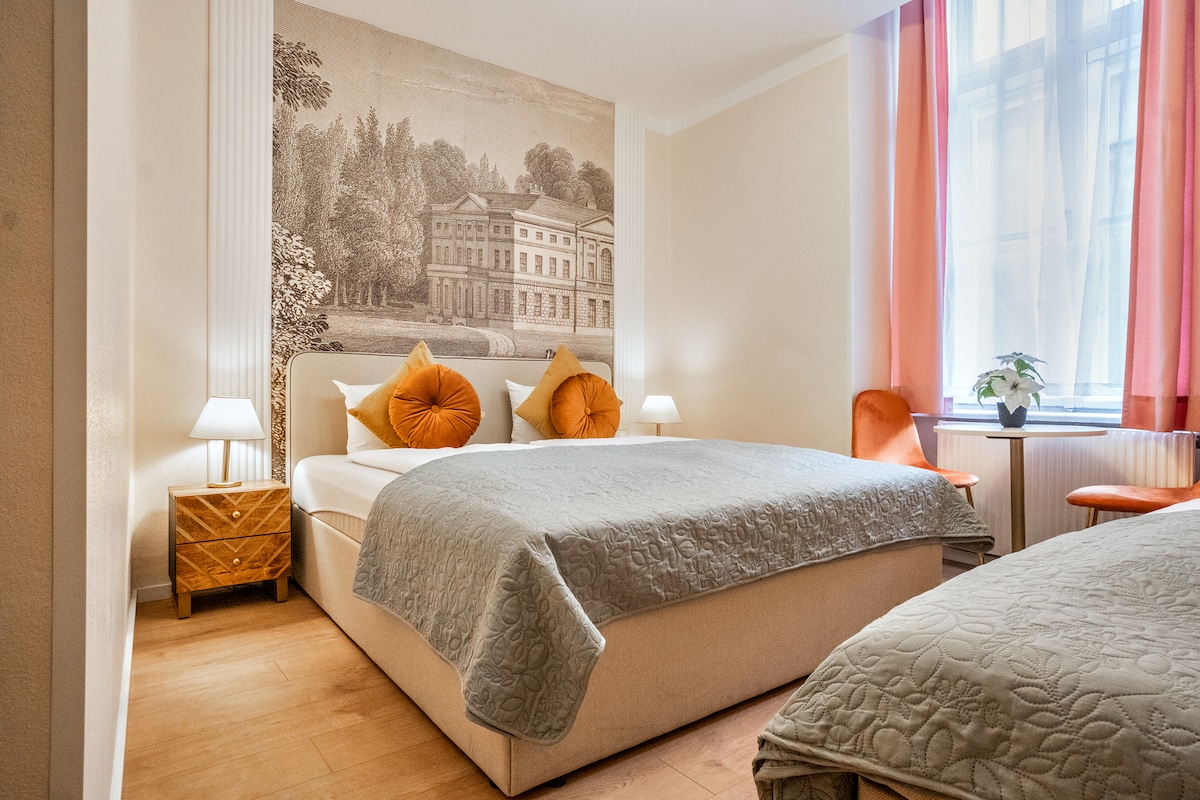 Dieses gemütliche Doppelzimmer verbindet klassischen Alt-Wiener Stil mit hellen, freundlichen Farben. Das Zimmer bietet ein komfortables Bett, viel Tageslicht, einen Schreibtisch sowie ein gepflegtes Badezimmer. Ideal für Paare oder Einzelgäste, die eine ruhige, charmante Unterkunft mit traditionellem Wiener Flair suchen.