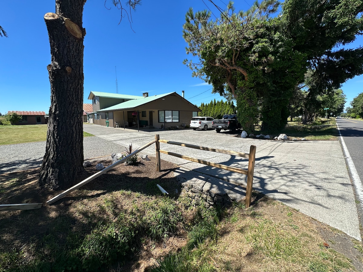 Light and bright bedroom with bay windows and lots of natural light, queen size bed, full closet, and private bathroom with a shower. This guestroom suite has a private entrance and parking right by the door. Located down a private road on 5 flat acres just minutes off of the freeway, 10mi to Birch Bay, beaches, Bellingham, and Canadian border