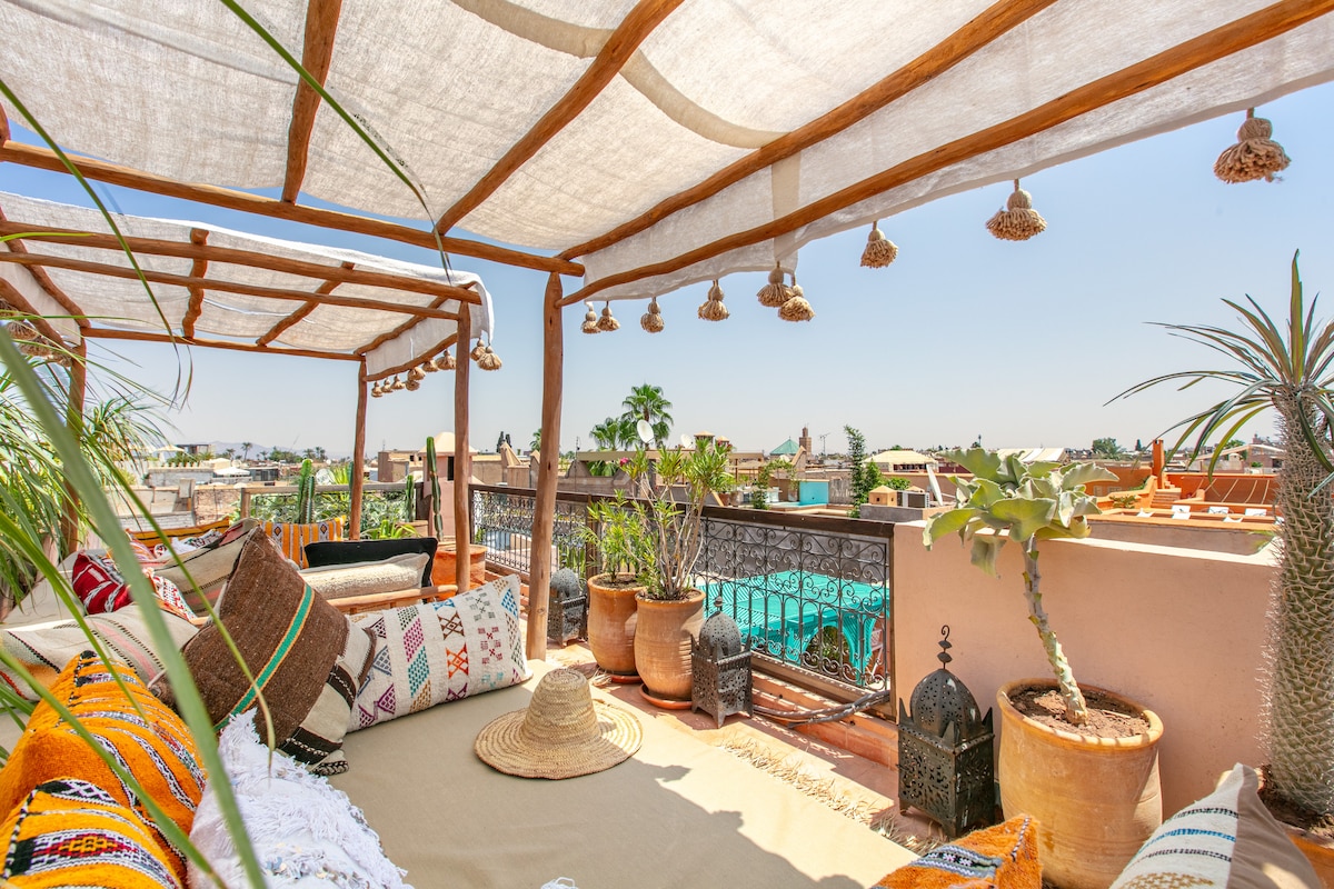 Siyakwamukela e-Dar Shariq ngo- @ LaSignatureMarrakech, i-oasis yakho yangasese enkabeni ye-Marrakech Medina. Ilungele imindeni noma amaqembu angaba ngu-10, le riad enhle inamakamelo angu-5 anamagumbi okugezela, uvulande wengadi yangaphakathi, nethala elisophahleni elinezitezi ezimbili elinokubukwa okungu-360°. Jabulela ukungena endaweni yokubhukuda ekhethekile, ukuhlanza indlu nsuku zonke, izisebenzi ezinakile, i-Wi-Fi enejubane eliphezulu, nesidlo sasekuseni kufakiwe. Imizuzu engu-5 nje ukusuka e-Souk nemizuzu engu-20 ukusuka e-Jemaa el-Fna. Ilungele umsebenzi ekude nokuphumula.