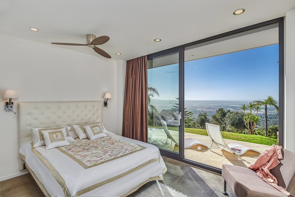 Villa « Eden Roc » is located about 14 kms from downtown Palma de Mallorca on the Baleares Islands. The closest beach, and ports are at 10 kms and 15 minutes by car . The airport can be joined in 15 minutes The property is new with a contemporary style, built on a hill (250high)in a private neighborhood. Space and silence in maximum privacy. With a southern exposure and a beautiful private Meditarranean garden on 10 000 sqm parcel all fence, the view is spectacular on 180 degrés angle.