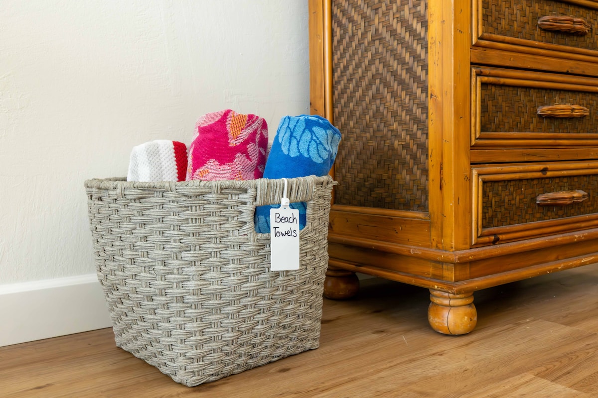 Izinsana nezingane zamukelekile! Izindawo zasolwandle, ibhishi ngaphesheya komgwaqo. I-lanai enkulu. Indawo yokudlela yangaphakathi nangaphandle. Ikamelo elikhulu, umbhede omkhulu, i-insuite, empumalanga ebheke i-lanai yesibili ngaphandle kwekamelo lokulala. Igumbi lokuphumula lokugezela lesivakashi. Umatilasi womoya owodwa wokuphakama okuphindwe kabili, i-pac n play, isihlalo esiphakeme. Isistimu yokuhlukanisa ethokomele nethule A/C. Amathoyizi, inqola yasebhishi, izambulela, izihlalo zasebhishi, amabhodi e-boogie, amathawula asebhishi anikeziwe. Eduze nezitolo nezindawo zokudlela. Izinkundla zethenisi nezindawo zokubhukuda ezimbili eziyinkimbinkimbi. Indawo yokupaka ebhukhiwe ngomnyango wangaphambili.