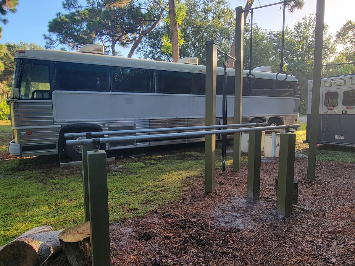 You'll love this unique and romantic escape. This amazing find is custom built. Its minutes to a dozen restaurants and 10 minutes to the best beaches in FL. It has a big kitchen (for a bus), TV and sound system in two rooms, a relatively large bath with shower. and each room has its own AC. It sleeps two in a king sized bed and a great reclining couch facing the TV/fireplace where a child could sleep. Its on a quiet three acres, private, away from our home there.