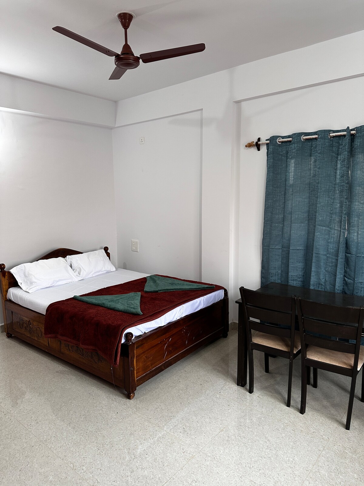 Zitike endaweni yethu yokuphumula eyenziwe ngezandla ye-chic 1BHK eqhayisa ngegumbi lokuphumula elivulekile elinosofa abakhulu netafula lekhofi lemabula. Phumula embhedeni osayizi we-Queen nomatilasi we-foam we-premium. Ikhishi elinakho konke linikeza izinto zikagesi zesimanje nokubukeka kwezindawo ezivundile. Phumula kubha yemabula ye-balcony noma izihlalo ezilengayo, ujabulele isihlahla se-chikoo esithulile nokuvakashelwa kwezinkawu ngezikhathi ezithile. Jabulela ukunethezeka nokuzola kuyo yonke imininingwane yendawo yethu enhle.