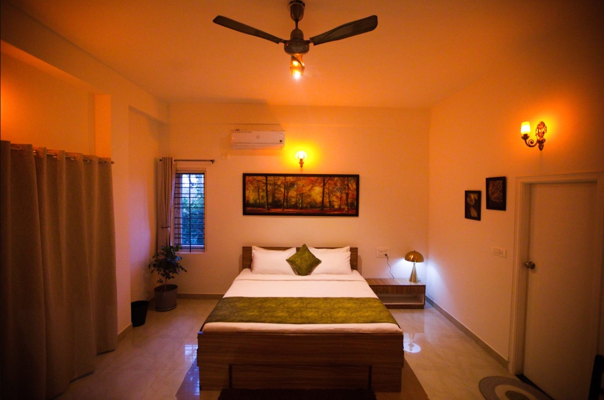Tucked away in the misty outskirts of Bangalore, Claystone Casa is a serene hill stay near Bangalore offering valley-view balconies, a 6000 sq ft fruit garden, and sun-drenched rooms. This eco stay in Karnataka features earthy interiors and an open-sky courtyard for starlit dining. Unwind with a home theater, karaoke, and BBQ setups. Just a short drive from the city, it’s an ideal farm house near Bangalore blending nature, comfort, and a touch of rustic charm.
