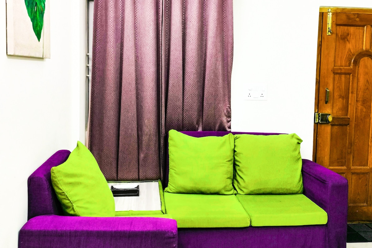 Make yourself at home in our cozy 2-bedroom apartment, located in a quiet nook of the bustling Bannimantap area, and yet close to several veg and non-veg restaurants, supermarkets, tourist attractions & taxi services. The apartment comes equipped with a kitchenette, comfortable living and dining areas, and a balcony. Bedrooms have air conditioning. We provide free toiletries, unlimited tea/coffee supplies, and mineral water. Note: You will have to climb about 14 steps to access your flat.