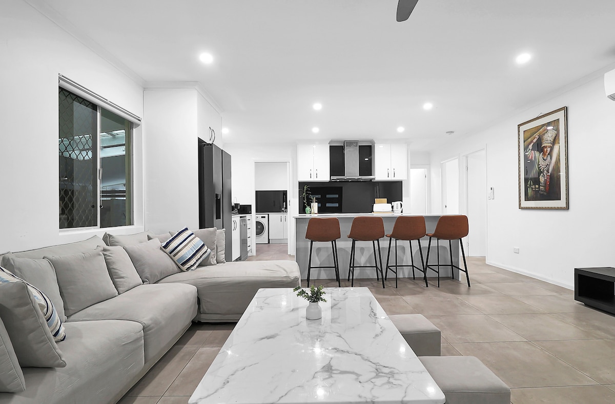 Jabulela ilanga ngamachibi angu-9 azungezwe izingadi ezincane zenkabazwe, izihlalo zompheme kanye ne-BBQs souround kanye nendawo yokuzivocavoca yangaphakathi ngakwesokudla ngaphandle komnyango wakho kule ndawo yokuhlala yangasese. Ifulethi lethu elisanda kuhlotshiswa line-cusions yomklami, ukuhlelwa kwetafula, ilineni lokunethezeka, umatilasi omusha wasentwasahlobo, umshini omusha wekhofi futhi uhlotshiswe ngokugcwele ukuze uhlale kahle. Imizuzu engu-15 kuphela uhamba ngezinyawo uya enkabeni yedolobha, u-20 uya e-Esplanade, kanye no-20 kuya esikhungweni sokuthenga sase-Cairns.
