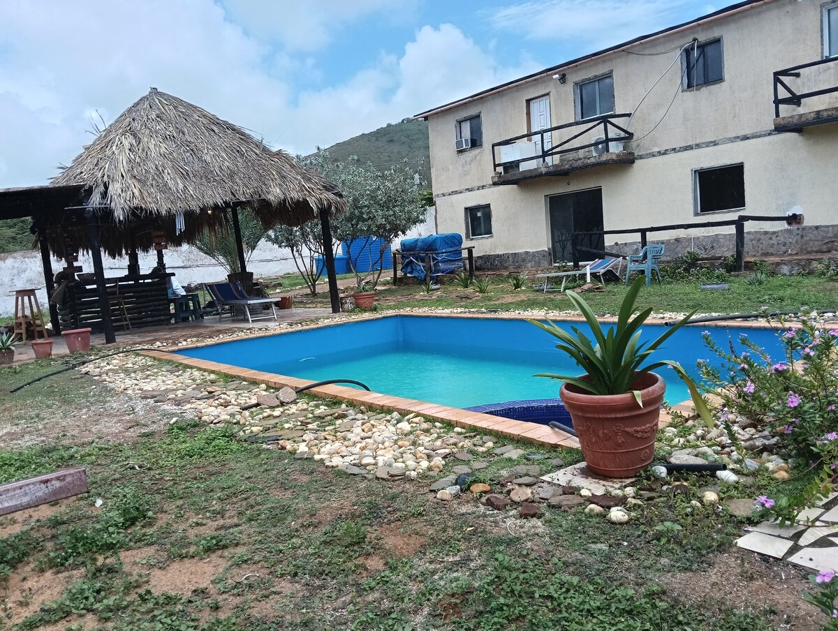 Relájate con toda la familia en este alojamiento donde la tranquilidad se respira. Caminerías extensas de puro verdor, piscina semi olímpica, A/C en habitaciones, tanque de agua, vigilancia 24 horas