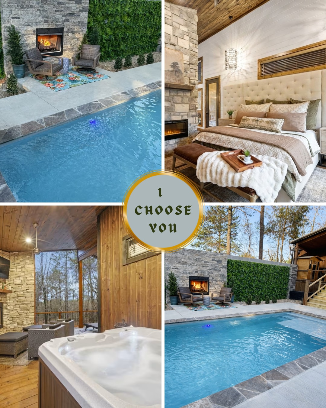 ✦ THE MALIBU ✦ • Pool with forest views— heated starting March 1st • 4 king suites, each with spa bathroom & direct pool access — built for couples travel • 8-person hot tub • 1.5 wooded acres of total seclusion — deer, songbirds, and pine forest silence • Floor-to-ceiling windows framing unobstructed tree canopy views • Covered deck with BBQ and firepit for evening gatherings • 10 minutes to Hochatown yet worlds away from the crowds • Professionally cleaned and inspected before every arrival