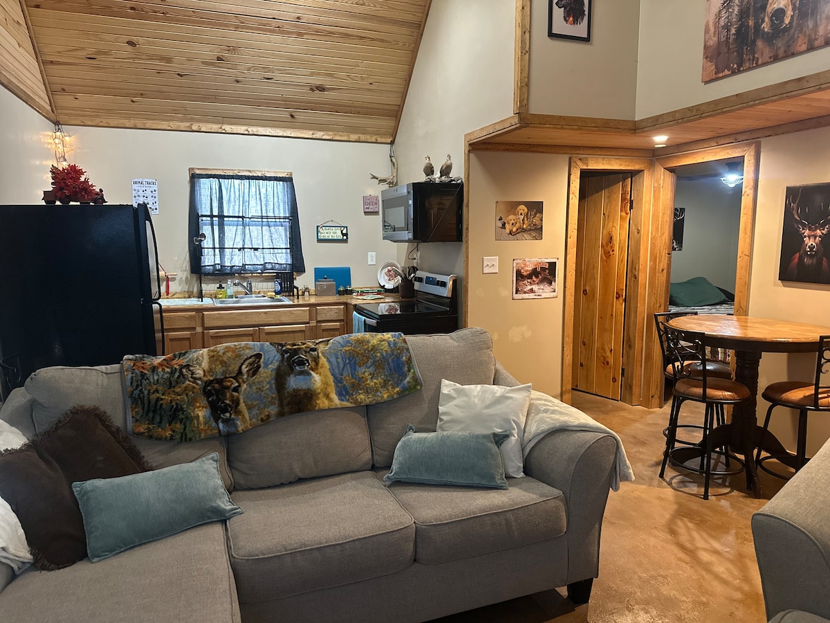Sinikeza okokuzithokozisa okunomusa. Le ndlu eyakhiwe ngamapulangwe esanda kulungiswa inikeza indawo ekahle kakhulu yokuvakasha. Nqamula, ngokuthatha incwadi noma elinye lamabhayisikobho owathandayo futhi uthokomale eduze nendawo yethu yomlilo. Sizungezwe amanzi, ngokudoba okungcono kakhulu e-Newton County. Indawo Kuhlanganisa ifriji, i-microwave, umshini wekhofi, isitofu segesi netafula lababili. Igumbi lokulala linombhede omkhulu nendawo enkulu yekhabethe. Siphinde sinikeze umshini wokuwasha nowokomisa. i-TV NE-WIFI